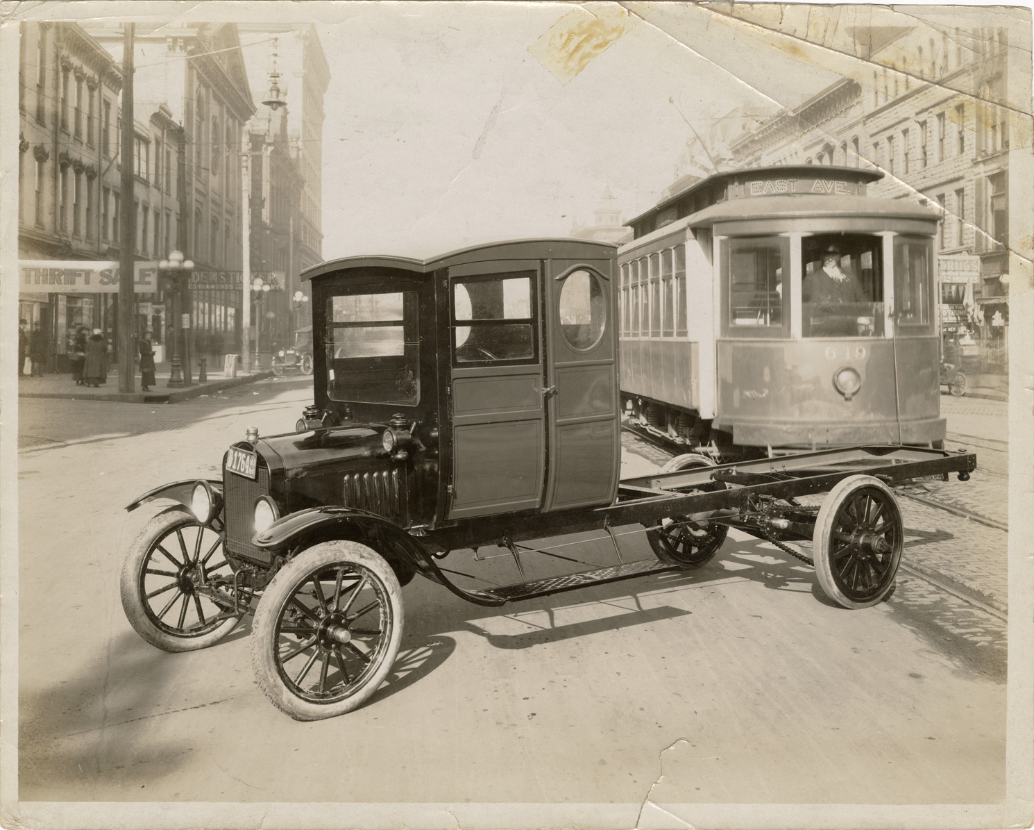 Favorite this☆ Truck chassis and streetcar Description: View of a truck chassis. East Ave. streetcar and commercial buildings in background. Handwritten on back: "New truck chassis & interurban, c.1915." Details Resource ID: na045333 Subject: Trucks--Chassis Cable cars (Streetcars) Photographic prints Date Issued: 1915 (year approximate) Format: 1 photographic print ; 8 x 10 in. Member of: National Automotive History Collection Filing Location: Motor trucks--Unidentified Rights: Physical rights are retained by DPL. Copyright is retained in accordance with U.S. copyright laws.