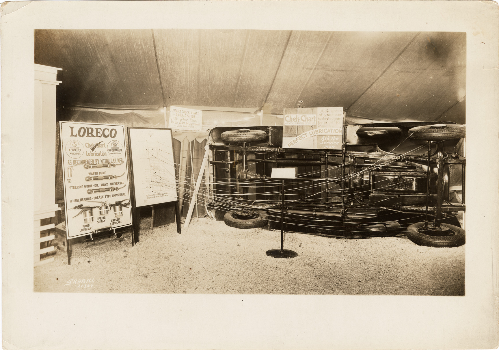 View of a Loreco motor oil display featuring the underside of a truck chassis and lubrication charts. Chart on left connects to lubrication points on truck with strings. Sign in background reads [in part]: "Chek-chart perfect lubrication." Handwritten on back: "Trucks, c.1920."