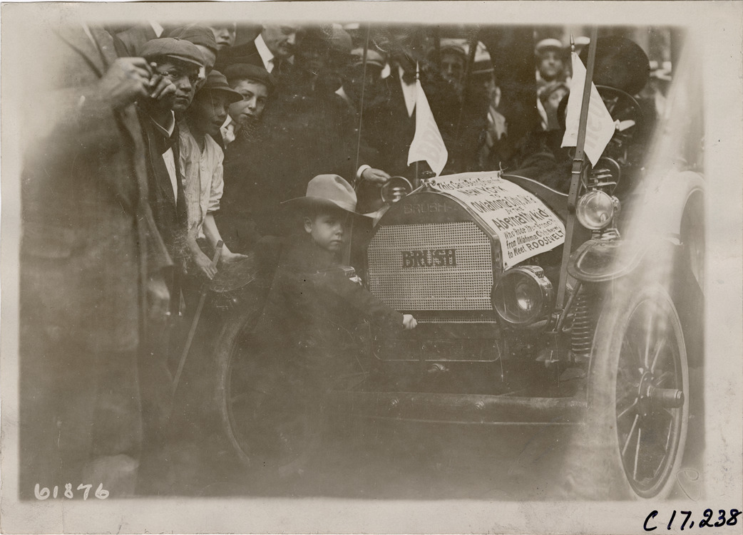 View of Temple Abernathy starting a Brush car. In 1910, Louis and Temple Abernathy, ages 9 and 6, drove a Brush car from New York to Oklahoma City. They were accompanied by their father, Jack, and other motorists. Banner on car reads: "This car is being driven from New York to Oklahoma City, Okla. by the Abernathy kids, who rode their bronchos from Oklahoma City to New York to meet Roosevelt." Onlookers in background. Stamped on back: "Spooner & Wells, Inc., photographers, telephones 3472-3473 Columbus, 1931 Broadway, New York." Handwritten on back: "Tours--Abernathy Kids New York to Oklahoma Tour, 1910."