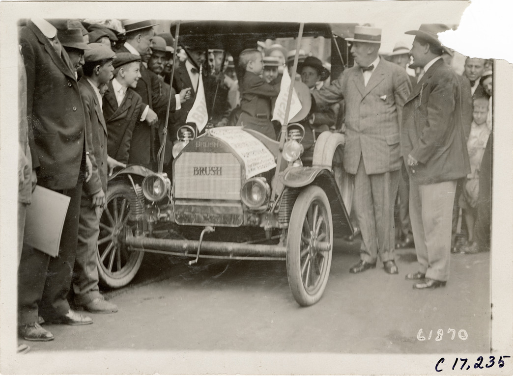 View of Louis and Temple Abernathy greeting onlookers from a Brush car. In 1910, Louis and Temple Abernathy, ages 9 and 6, drove a Brush car from New York to Oklahoma City. They were accompanied by their father, Jack, and other motorists. Banner on car reads: "This car is being driven from New York to Oklahoma City, Okla. by the Abernathy kids, who rode their bronchos from Oklahoma City to New York to meet Roosevelt." Stamped on back: "Spooner & Wells, Inc., photographers, telephones 3472-3473 Columbus, 1931 Broadway, New York." Handwritten on back: "Tours--Abernathy Kids New York to Oklahoma Tour, 1910."