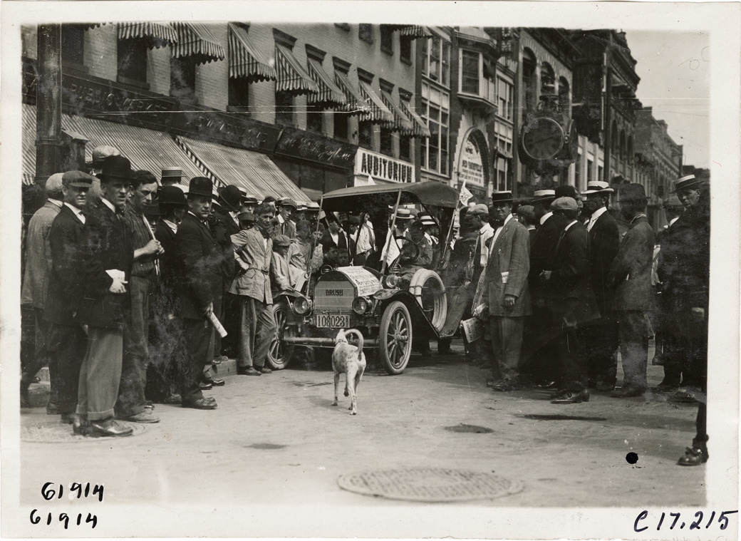 View of brothers Louis and Temple Abernathy in Brush car, surrounded by onlookers. Dog in foreground; banner on car reads: "This car is being driven from New York to Oklahoma City, Okla. by the Abernathy kids, who rode their bronchos from Oklahoma City to New York to meet Roosevelt." In 1910, Louis and Temple Abernathy, ages 9 and 6, drove a Brush car from New York to Oklahoma City. They were accompanied by their father, Jack, and other motorists. Stamped on back: "Spooner & Wells, Inc., photographers, telephones 3472-3473 Columbus, 1931 Broadway, New York." Handwritten on back: "Tours--Abernathy Kids New York to Oklahoma Tour, 1910."