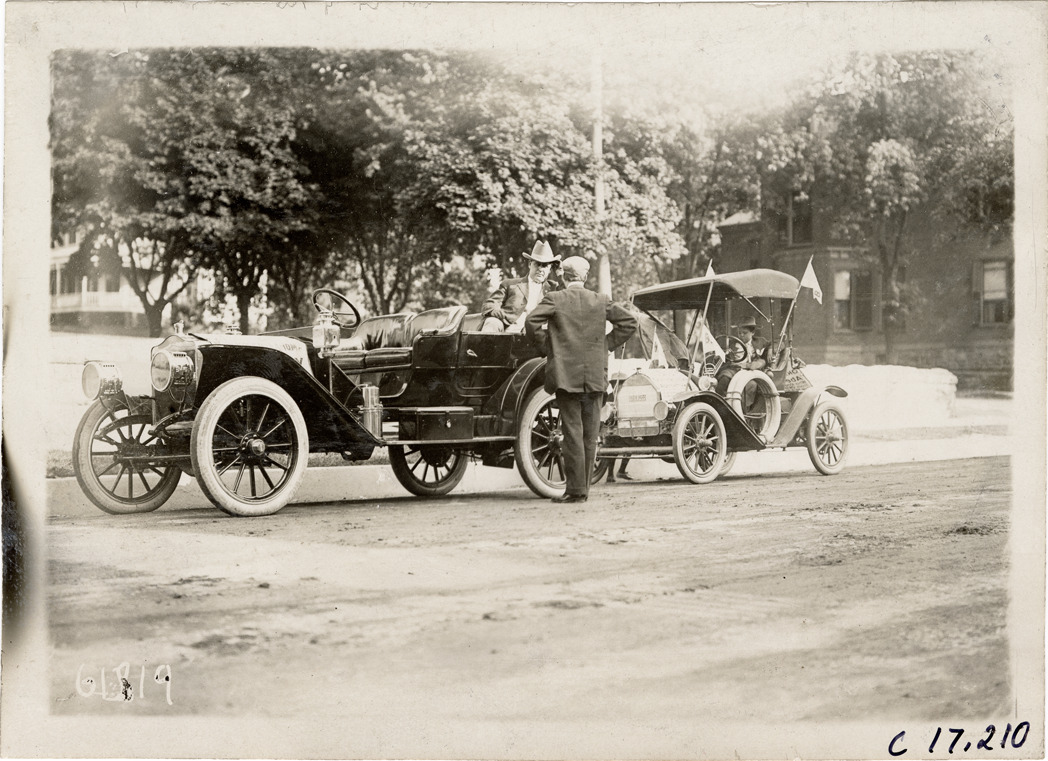 View of Brush and Maxwell cars parked in street. Louis Abernathy is visible in Brush car; Jack Abernathy is in rear seat of Maxwell car. In 1910, Louis and Temple Abernathy, ages 9 and 6, drove a Brush car from New York to Oklahoma City. They were accompanied by their father, Jack, and other motorists. Stamped on back: "Spooner & Wells, Inc., photographers, telephones 3472-3473 Columbus, 1931 Broadway, New York." Handwritten on back: "Tours--Abernathy Kids New York to Oklahoma Tour, 1910."