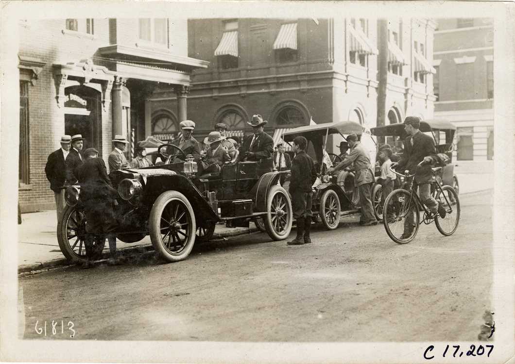 View of Brush and Maxwell cars parked in street. Louis Abernathy is visible in Brush car; Temple and Jack Abernathy are in Maxwell car. Boy with bicycle on right. In 1910, Louis and Temple Abernathy, ages 9 and 6, drove a Brush car from New York to Oklahoma City. They were accompanied by their father, Jack, and other motorists. Stamped on back: "Spooner & Wells, Inc., photographers, telephones 3472-3473 Columbus, 1931 Broadway, New York." Handwritten on back: "Tours--Abernathy Kids New York to Oklahoma Tour, 1910."