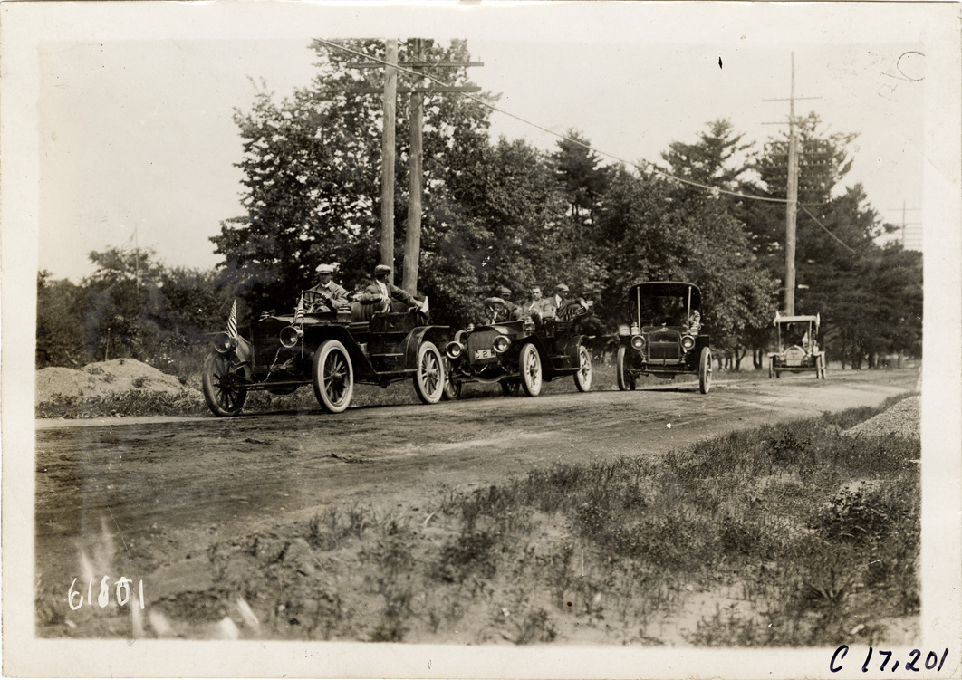 View of motorists in Brush and Maxwell cars, along with two unidentified cars, on roadside. In 1910, Louis and Temple Abernathy, ages 9 and 6, drove a Brush car from New York to Oklahoma City. They were accompanied by their father, Jack, and other motorists. Stamped on back: "Spooner & Wells, Inc., photographers, telephones 3472-3473 Columbus, 1931 Broadway, New York." Handwritten on back: "Tours--Abernathy Kids New York to Oklahoma Tour, 1910."
