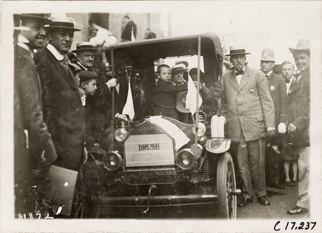 View of brothers Louis and Temple Abernathy greeting onlookers from a Brush car. Banner on car reads: "This car is being driven from New York to Oklahoma City, Okla. by the Abernathy kids, who rode their bronchos from Oklahoma City to New York to meet Roosevelt." In 1910, Louis and Temple Abernathy, ages 9 and 6, drove a Brush car from New York to Oklahoma City. They were accompanied by their father, Jack, and other motorists. Stamped on back: "Spooner & Wells, Inc., photographers, telephones 3472-3473 Columbus, 1931 Broadway, New York." Handwritten on back: "Tours--Abernathy Kids New York to Oklahoma Tour, 1910."