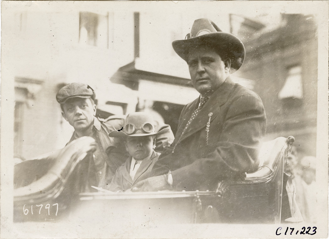 Close-up view of Temple and Jack Abernathy. Unidentified man on left. In 1910, Louis and Temple Abernathy, ages 9 and 6, drove a Brush car from New York to Oklahoma City. They were accompanied by their father, Jack, and other motorists. Stamped on back: "Spooner & Wells, Inc., photographers, telephones 3472-3473 Columbus, 1931 Broadway, New York." Handwritten on back: "Tours--Abernathy Kids New York to Oklahoma Tour, 1910."