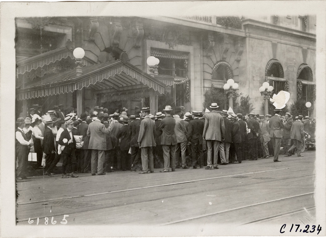 View of crowd of onlookers surrounding Brush car. In 1910, Louis and Temple Abernathy, ages 9 and 6, drove a Brush car from New York to Oklahoma City. They were accompanied by their father, Jack, and other motorists. Stamped on back: "Spooner & Wells, Inc., photographers, telephones 3472-3473 Columbus, 1931 Broadway, New York." Handwritten on back: "Tours--Abernathy Kids New York to Oklahoma Tour, 1910."