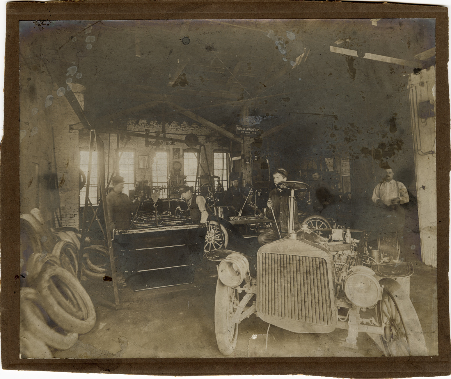 View of workers manufacturing Manistee cars in the garage of the American Garage & Motor Co. Label on back: "From G.E. Brugman. Manufacturing operations at the garage of the American Garage & Motor Co. The chassis in the background is a Manistee car under construction. The car in the foreground appears to be another make being rebuilt although it might have been a different version of the Manistee. As a small boy (1914) I seem to remember the several abandoned old cars in the River & Smith St. factory as being like the one in the foreground. Otto Brugman is the man standing to the right of the seat assembly. The sign 'Morgan & Wright' tires is, I believe, the predecessor of U.S. Rubber Co., Detroit, Mich."