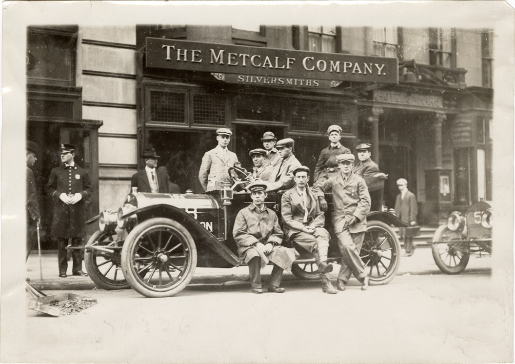 View of motorists posing with Marathon car no. 58 during the 1911 Glidden Tour. Marathon car no. 57 is partially visible on right; Metcalf Company, silversmiths, store in background. Stamped on back: "Spooner & Wells, Inc., photographers, telephones 3472-3473 Columbus, 1931 Broadway, New York." Handwritten on back: "Marathon, 1911."