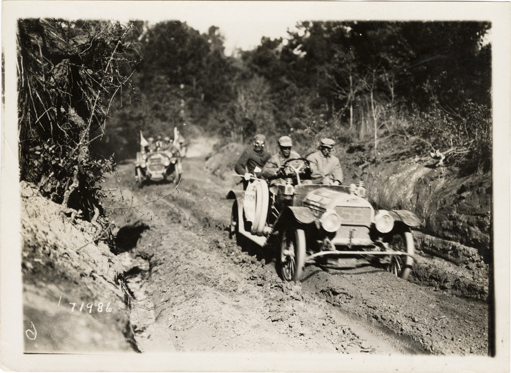 Motorists in 1911 Marathon automobile traveling on rural road, 1911 Glidden Tour
