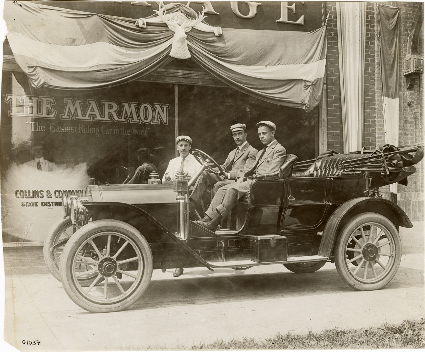View of driver Ray Harroun and motorists posing with Marmon car. "The Marmon, the easiest riding car in the world. Collins & Company, State distr[ibutors]" is painted on window in background; window is decorated with bunting and an elk's head. Handwritten on back: "Marmon, ca. 1910. R. Harroun, dr."
