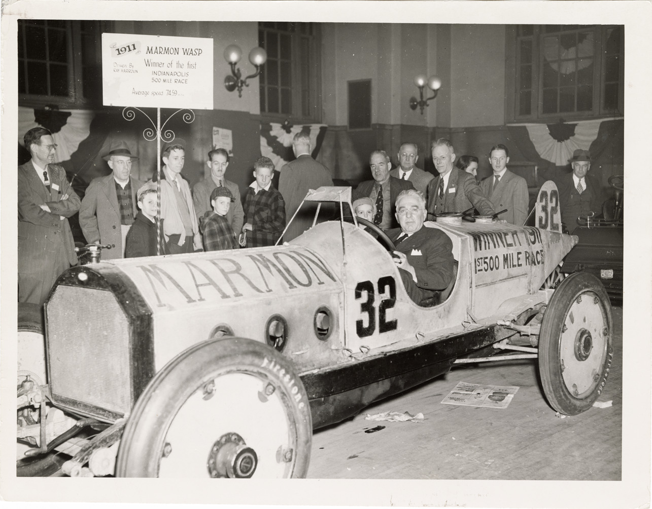 View of driver Harry H. Cobe posing in 1911 Marmon Wasp car no. 32. Sign reads: "1911 Marmon Wasp. Winner of the first Indianapolis 500 Mile Race. Average speed 74.59 m.p.h. Driven by Ray Harroun." Onlookers in background. Stamped on back: "Photographs Alexandre Coste, 22 Atwood St., Wellesley, Mass." Handwritten on back: "Harry H. Cobe (COBE), 156 Bridge St., Manchester, N.H. at wheel of Wasp. He drove in same race with Ray Harroun in 1911 Indianapolis Sweepstakes."