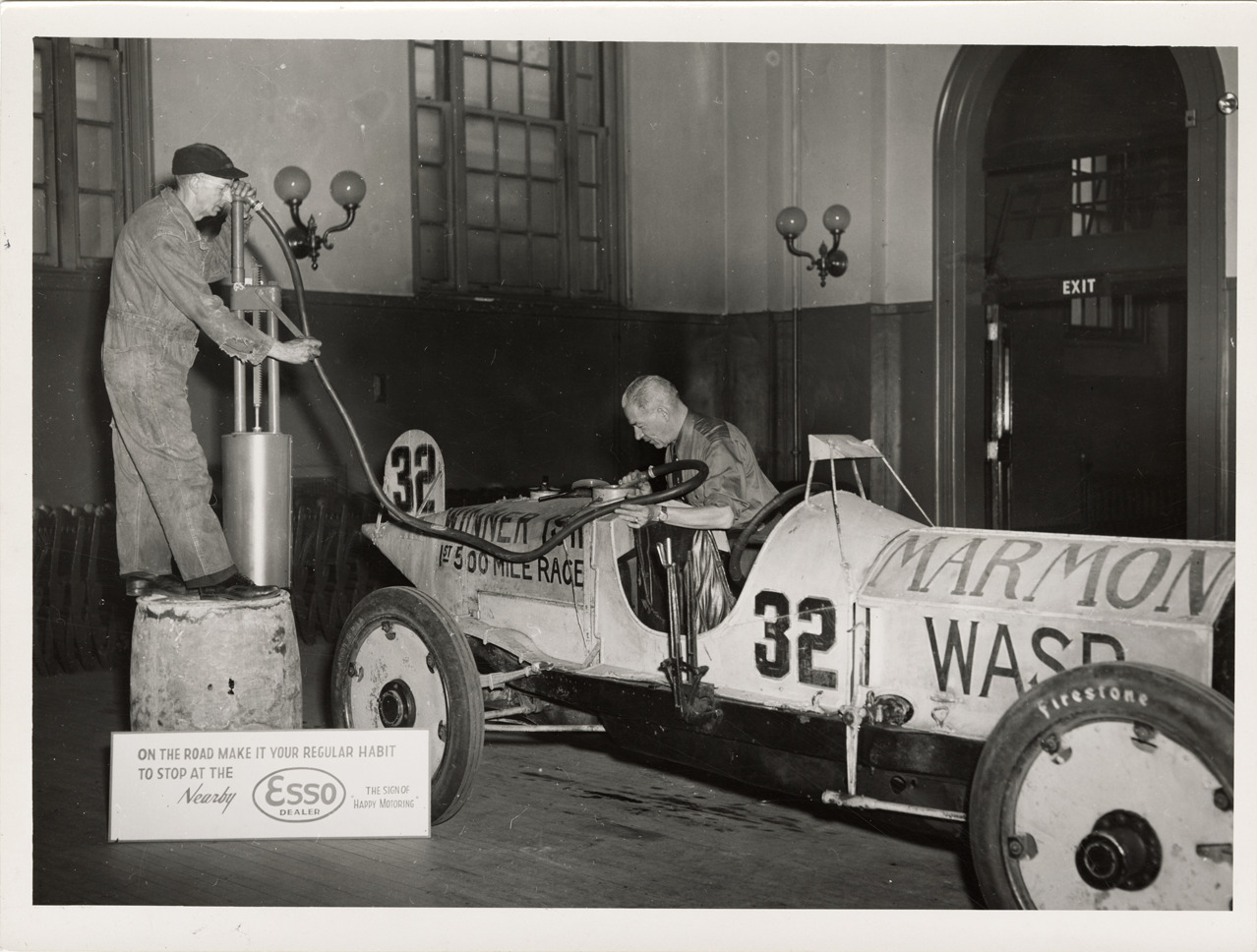 View of Bill Sylvester fueling 1911 Marmon Wasp car no. 32 from portable gas pump. Mr. Townsend in car. Sign in foreground reads: "On the road make your regular habit to stop at the nearby Esso dealer, the sign of happy motoring." Stamped on back: "Alexandre Coste. Photocraft, 22 Atwood St., Wellesley 81, Mass." Handwritten on back: "Bill Sylvester manning portable pump for Townsend & the Wasp."