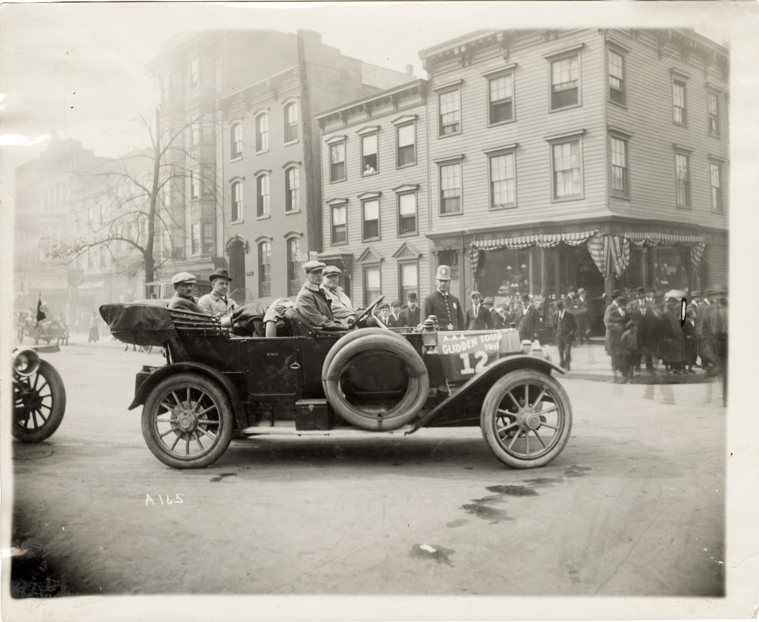 View of motorists posing in Marmon car no. 12 during the 1911 Glidden Tour. Stamped on back: "Spooner & Wells, Inc., photographers, telephones 3472-3473 Columbus, 1931 Broadway, New York." Handwritten on back: "Marmon, ca. 1911."