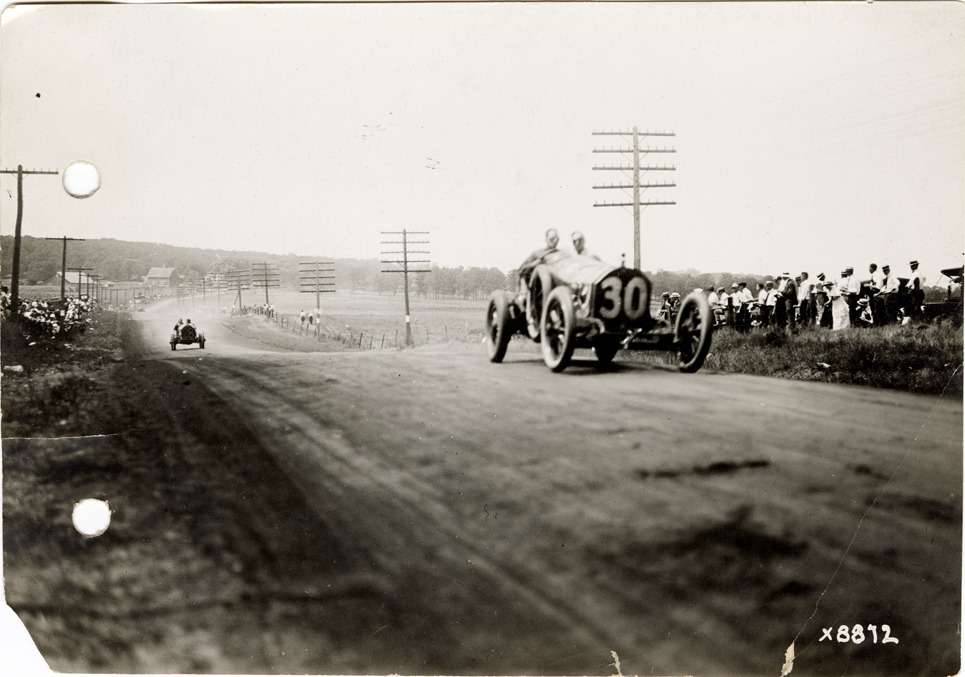 View of Lou Heineman racing Marmon car no. 30 and Hoskins racing Chadwick car no. 28 on course during the 1914 Elgin Races in Illinois. Handwritten on back: "Lou Heineman in Marmon #30 leading Hoskins in Chadwick #28 on the home stretch. Elgin Races, 1914."