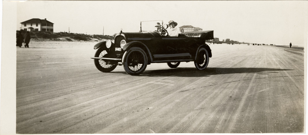 View of motorists posing in a Marmon car on Ormond Beach in Florida. Handwritten on back: "On famous Ormond Beach track, Florida. Marmon, ca. 1917."