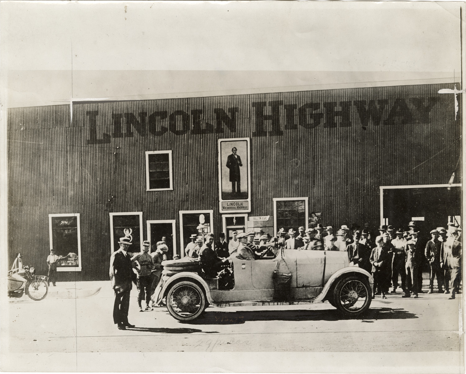View of motorists and onlookers posing with a Marmon car at Ely, Nevada. "Lincoln Highway" is painted on building in background. Label on back: "The Marmon 34 at Ely, Nev."