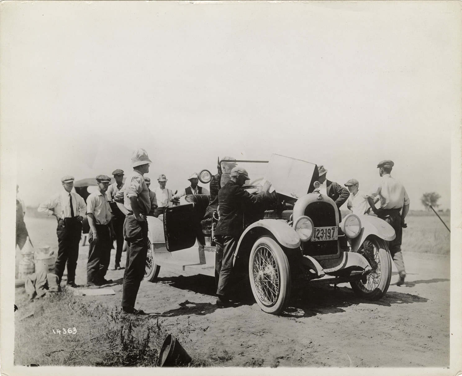 View of motorists and onlookers with a 1916 Marmon "34" car in North Platte, Nebraska, during a transcontinental tour. Label on back: "The Marmon 34 at North Platte, Neb." Handwritten on back: "Marmon, transcontinental, 1916."