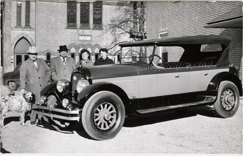 Motorists and dog posing with 1924 Marmon automobile