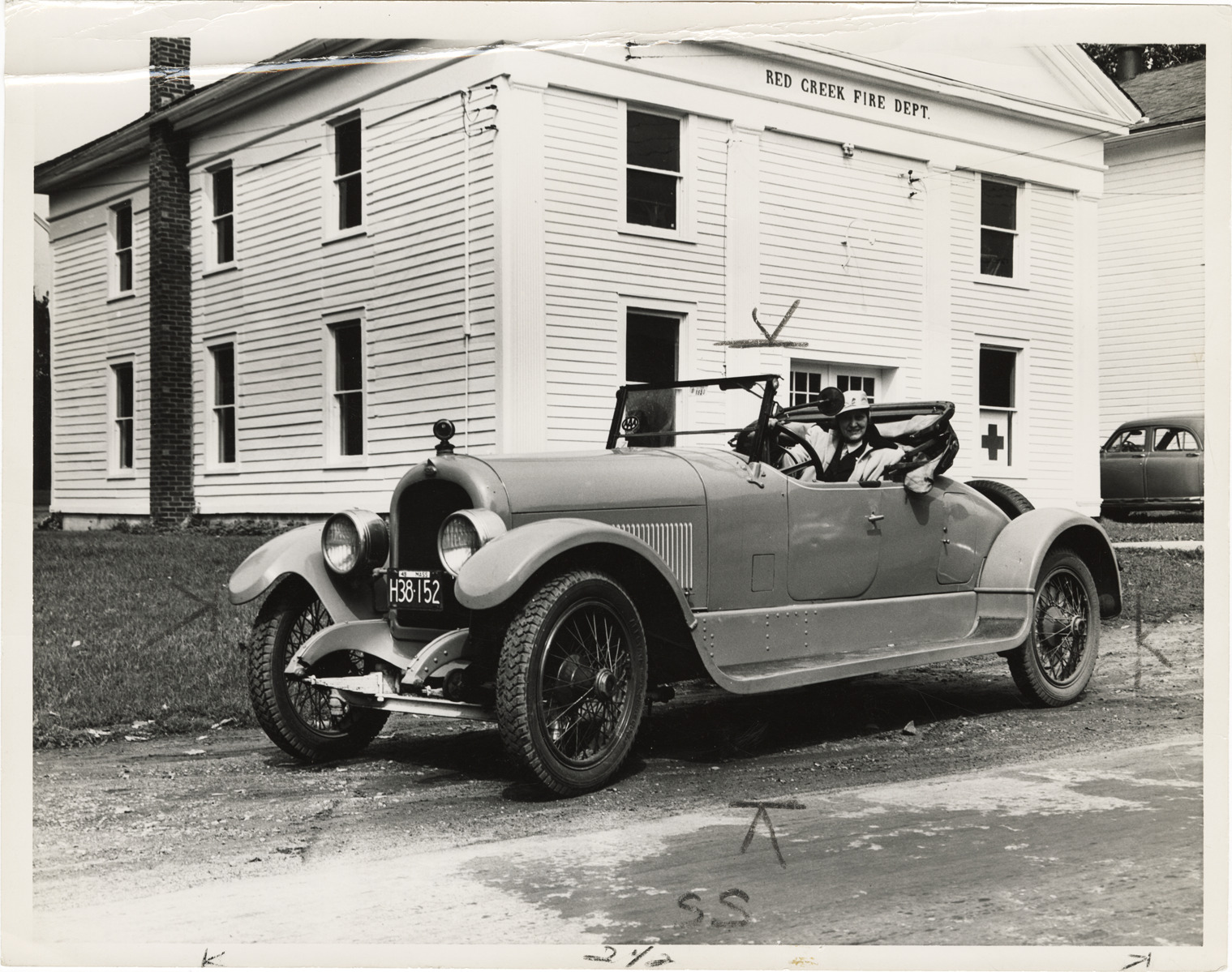View of Helen Mattson posing in a 1923 Marmon speedster. Red Creek Fire Dept. station building in background. Stamped on back: "Photo by E. Treloar, 101 California, Highland Park, Mich. TO. 9-0628." Handwritten on back: "9-14-50. 90GT Marmon. Mattson. After lunching in Red Creek, N.Y. Mrs. Helen Mattson of Dorchester, Mass., gets behind the wheel of her 1923 Marmon speedster on trip to Rochester. Marmon, 1923. Speedster, Model 34."