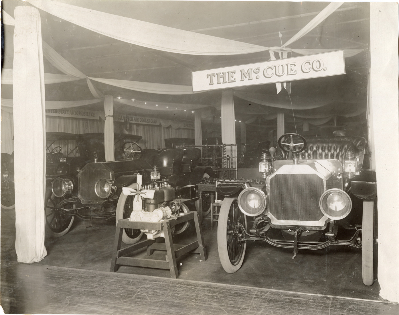 View of 1909 McCue cars and engine on display at trade show. "The McCue Co." sign is displayed over exhibit. Stamped on back: "Spooner & Wells, Inc., photographers, telephones 3472-3473 Columbus, 1931 Broadway, New York." Handwritten on back: "McCue, 1909."