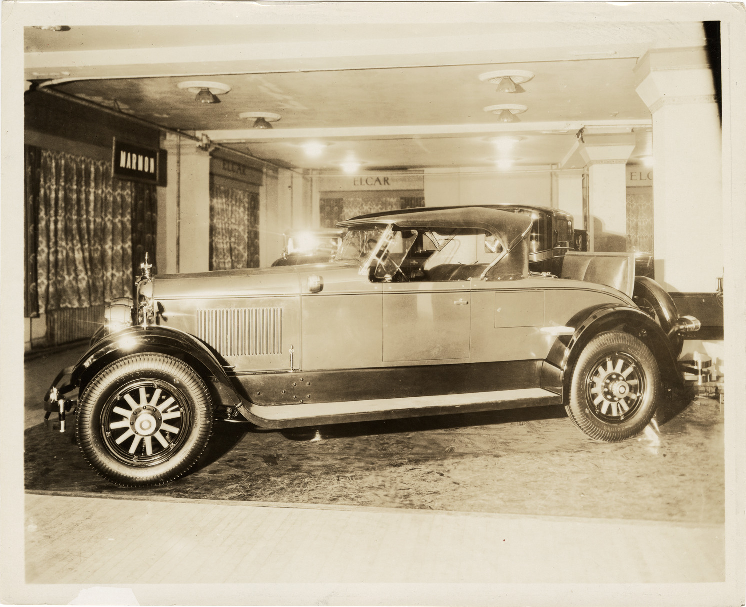 View of a Marmon roadster. "Marmon" sign is visible in background. Stamped on back: "N. Lazarnick, commercial photographers, makers of industrial motion pictures, 1440 B'way (at 40th St.), N.Y., Tel. Chickering 1717. 5005 Euclid Ave., Cleve., Randolph 7852." Handwritten on back: "Marmon roadster. Marmon, app. 1925."