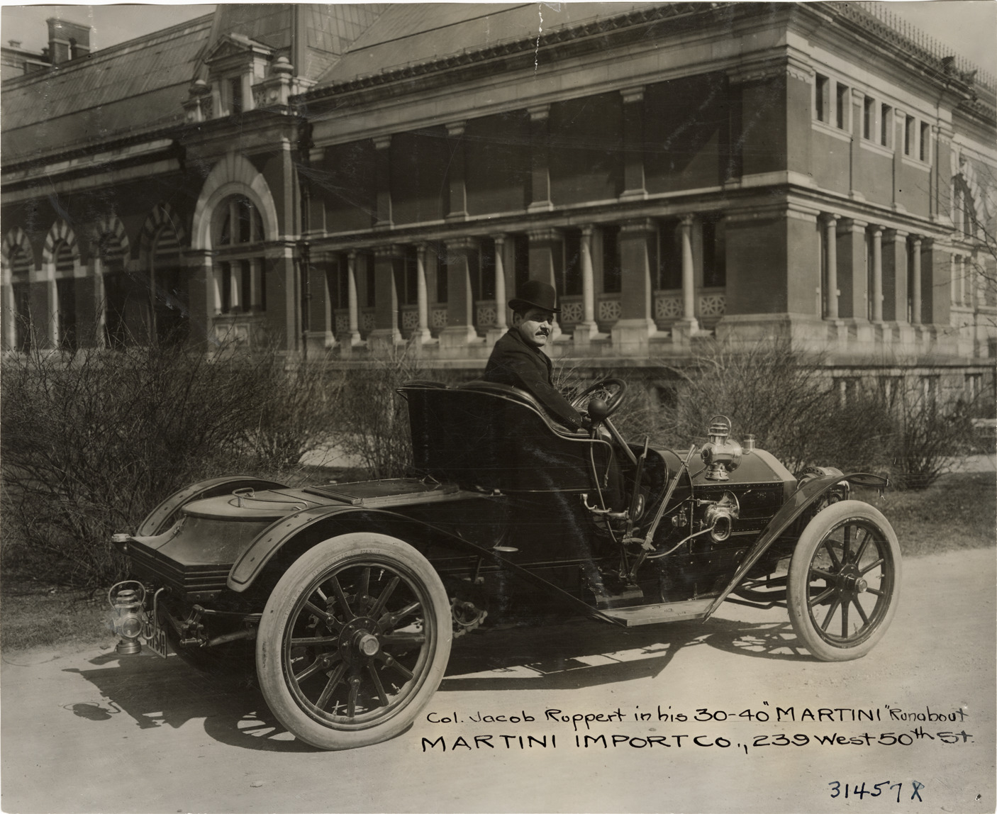 View of Colonel Jacob Ruppert posing in Martini car. Printed on front: "Col. Jacob Ruppert in his 30-40 Martini runabout. Martini Import Co., 239 West 50th St." Stamped on back: "Spooner and Wells, 1931 Broadway, New York, duplicates any time, enlargements all sizes, tel. 3472-3473 Col., credit appreciated." Handwritten on back: "Martini, ca. 1908."