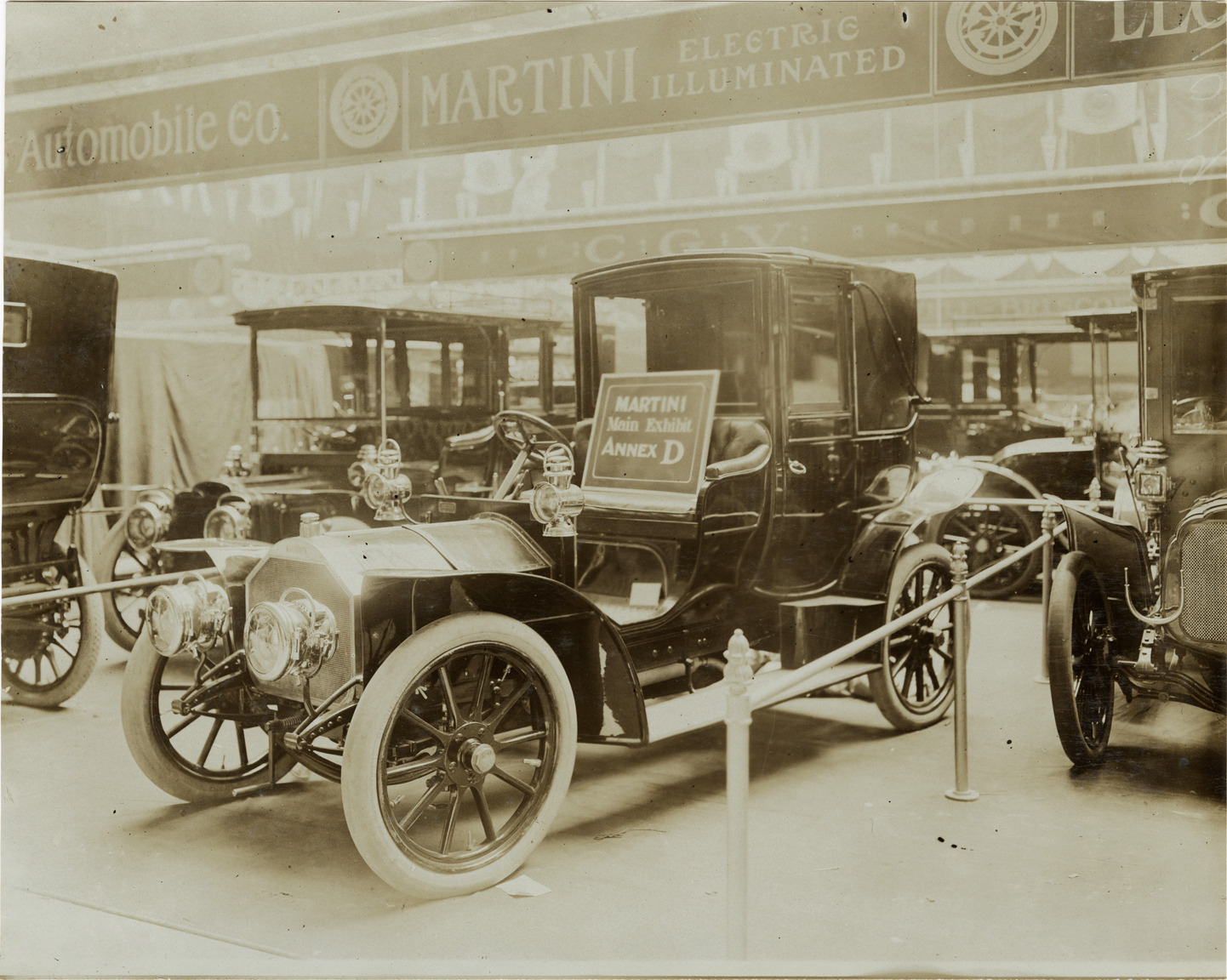 View of Martini cars on display at trade show. Sign on car reads: "Martini, main exhibit, Annex D." "Martini, electric illuminated" sign is displayed overhead. Stamped on back: "Photo by F. Ed. Spooner, 1536 B'way, telephone 6536-38th St., New York, N.Y." Handwritten on back: "Martini, ca. '06."