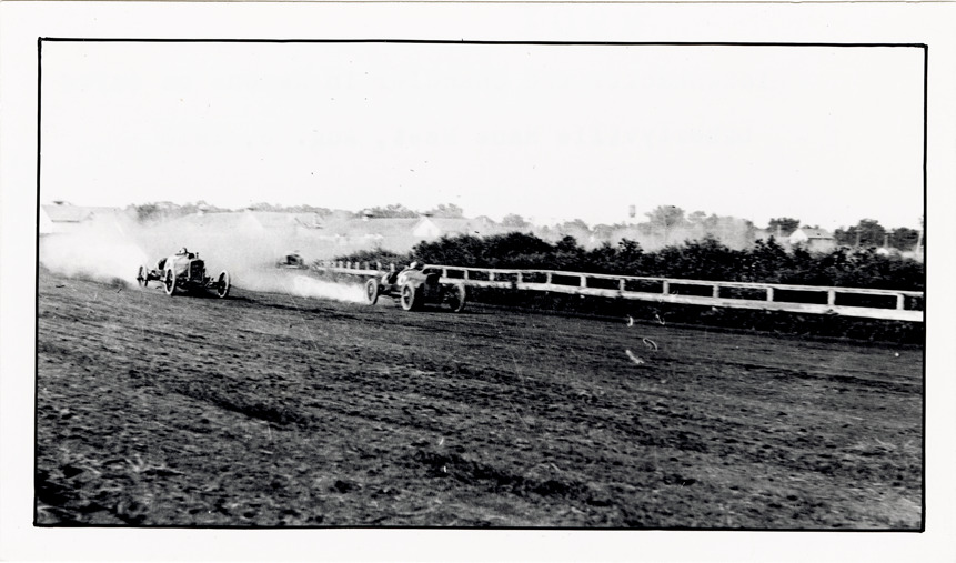 View of Eddie Rickenbacker and Billy Chandler racing Mason cars during the 1913 Libertyville Race Meet in Illinois. Stamped on back: "Photo by Albert Mecham, Highwood, Ill." Typed on back: "Rickenbacker and Chandler in Masons on curve, Libertyville Race Meet, Aug. 9, 1913."