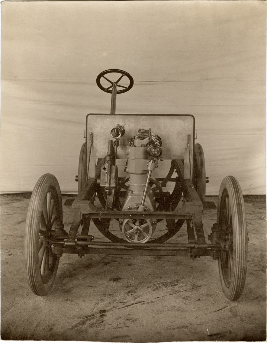 Front view of a chassis for a 1904 Matheson car. Stamped on back: "Demers & Son, artists and photographers. 207 Main St., Holyoke, Mass." Handwritten on back: "1904, Matheson."