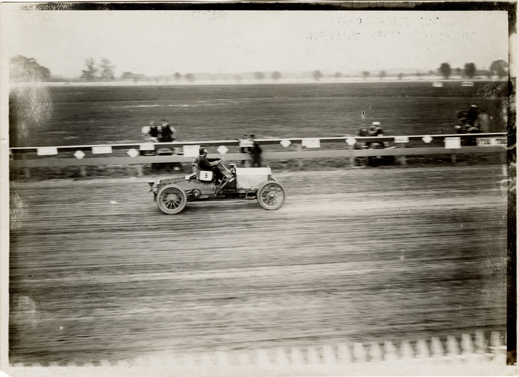 View of driving racing Matheson car no. 9 on track during the 1907 24-hour Race at Point Breeze Park in Philadelphia, Pennsylvania. Stamped on back: "N. Lazarnick, 29 West 42nd Street, New York." Handwritten on back: "Matheson car. 24 hour, Phila., 1907."