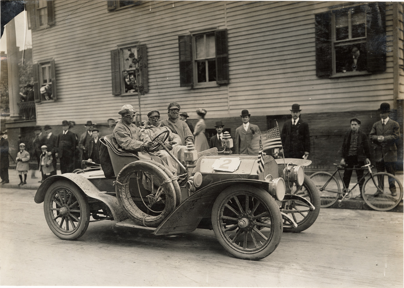 View of motorists posing in a Matheson car during the 1907 Newark Automobile and Motor Club Endurance Run. Onlookers stand on sidewalk. Handwritten on back: "Matheson, 1907. Newark A.C. Endurance Run. May 30-31 & June 1. The Matheson makes perfect score."