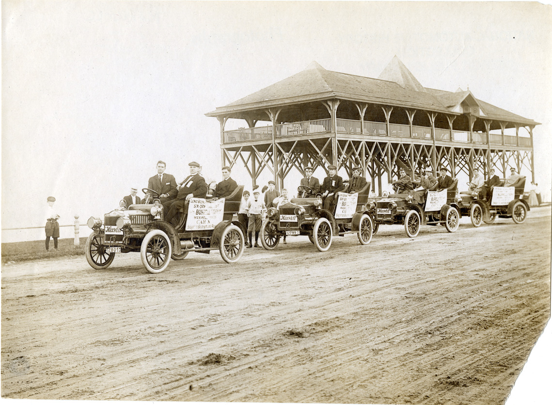 View of motorists posing in four Maxwell cars for the 1905 Long Branch Automobile Carnival Six-Day Tire Test for the Burrelle Trophy. Pavilion in background. Handwritten on back: "Maxwell."