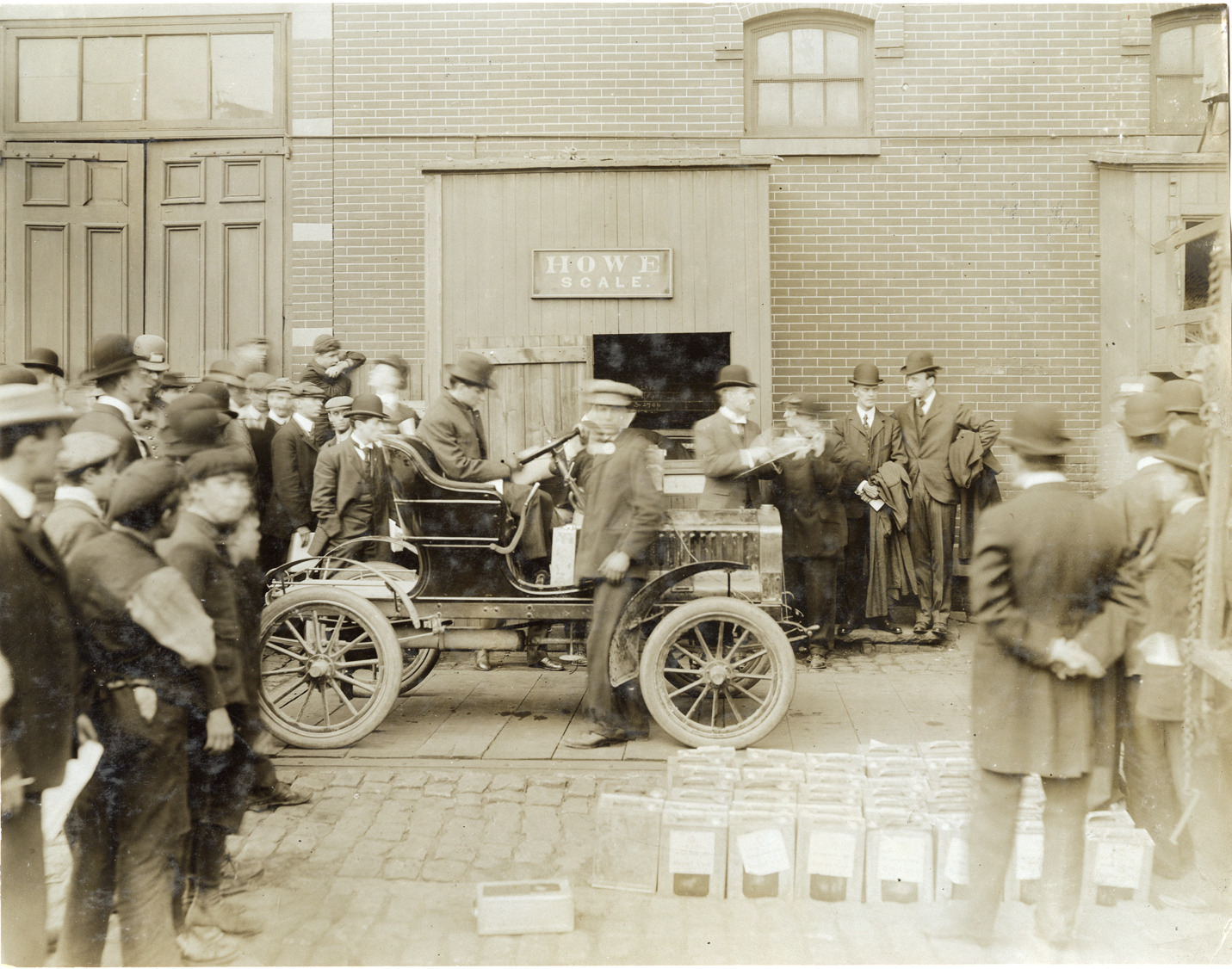 View of motorists in a Maxwell car, surrounded by onlookers. Car is being weighed on Howe scale. "Howe scale" sign in background. Fuel cans in foreground. Stamped on back: "Photo by F. Ed. Spooner, 1536 B'way, telephone 6536-38th St., New York, N.Y." Handwritten on back: "Maxwell, ca. 1906."