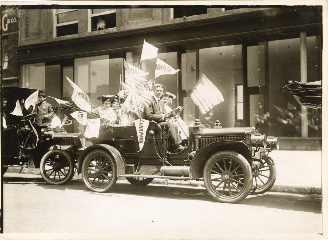 View of a driver and children posing in a Maxwell car at Coney Island. Children wave "Luna Park" pennants. Stamped on back: "Photo by N. Lazarnick, 29 West 42nd Street, N.Y., tel. 594 Bryant." Handwritten on back: "Maxwell, ca. 1907."