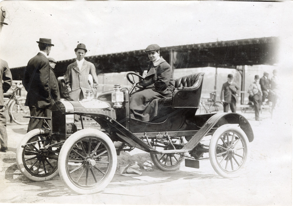View of a motorist posing in a Maxwell car at 1909 Fort George Hill Climb in New York, New York. Stamped on back: "Spooner & Wells, Inc., photographers, telephones 3472-3473 Columbus, 1931 Broadway, New York." Handwritten on back: "Maxwell, ca. 1909. Ft. George Hill Climb."