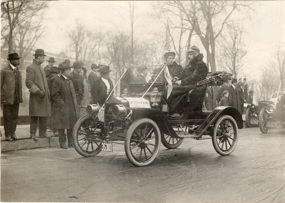 View of Bertha M. Rittwetzen and passenger in Maxwell car during the 1909 New York to Philadelphia Run sponsored by the Women's Motoring Club. Stamped on back: "Spooner & Wells, Inc., photographers, telephones 3472-3473 Columbus, 1931 Broadway, New York." Handwritten on back: "Miss B.M. Rittwetzen. Maxwell, 1909. Model: LD."
