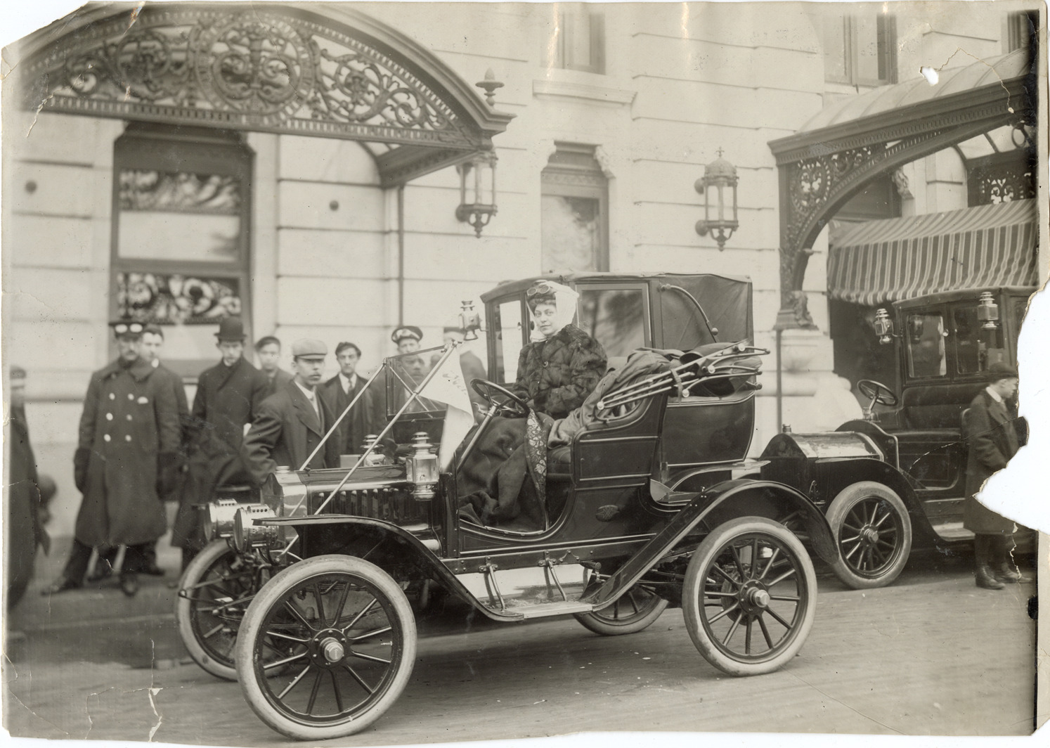 View of Bertha M. Rittwetzen posing in Maxwell car during the 1909 New York to Philadelphia Run sponsored by the Women's Motoring Club. Stamped on back: "Spooner & Wells, Inc., photographers, telephones 3472-3473 Columbus, 1931 Broadway, New York." Handwritten on back: "Miss Gillespie [sic] at Plaza Hotel, Maxwell. Ladies NY-Phila. Run, 1909."
