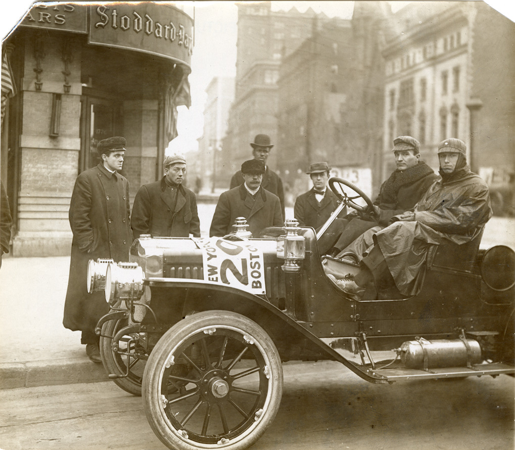 Motorists posing in Maxwell automobile, 1909 New York to Boston Endurance Run