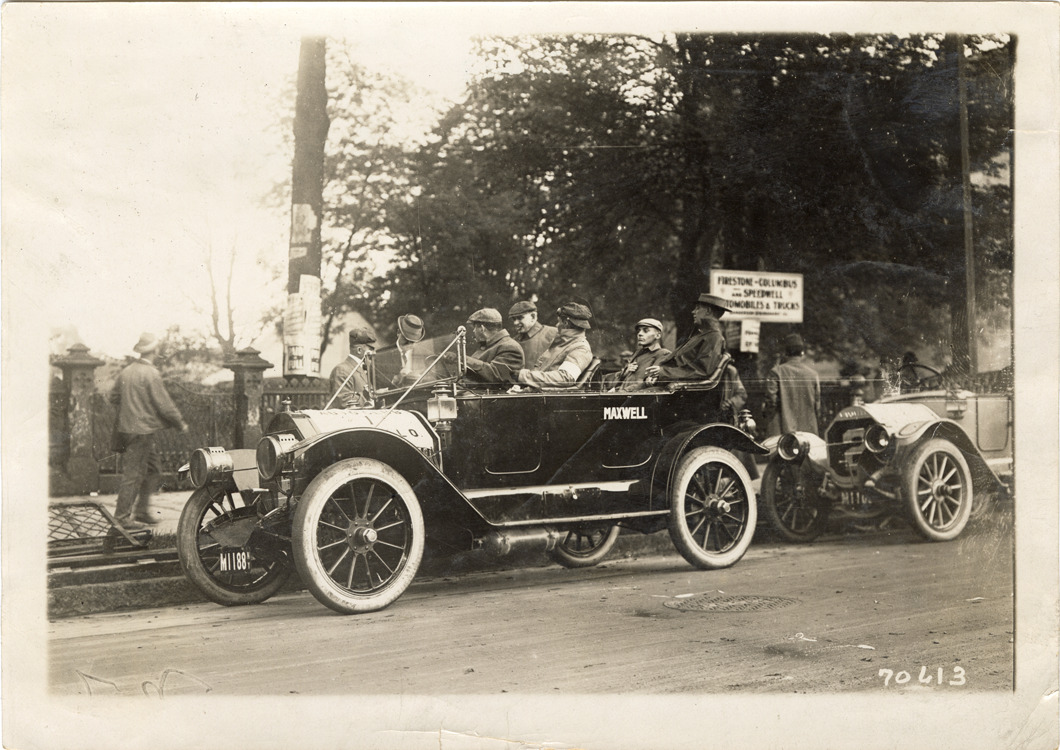 View of motorists in a Maxwell car. Stamped on back: "Spooner & Wells, Inc., photographers, telephones 3472-3473 Columbus, 1931 Broadway, New York." Handwritten on back: "Maxwell, ca. 1912."