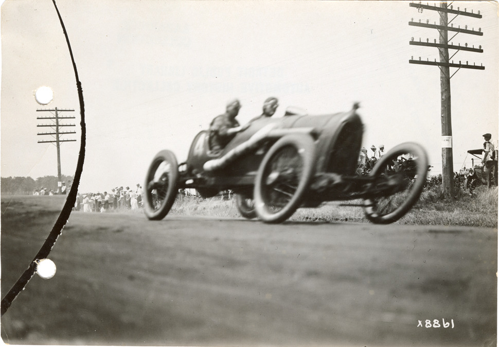 View of Teddy Tetzlaff driving Maxwell car no. 4 at the 1914 Elgin Races in Illinois. Stamped on back: "Spooner & Wells, Inc., photographers, 1231 Woodward Ave., Detroit, Mich." Handwritten on back: "Teddy Tetzlaff in Maxwell #4 coming into home stretch. Elgin Races, 1914. Maxwell, T. Tetzlaff."
