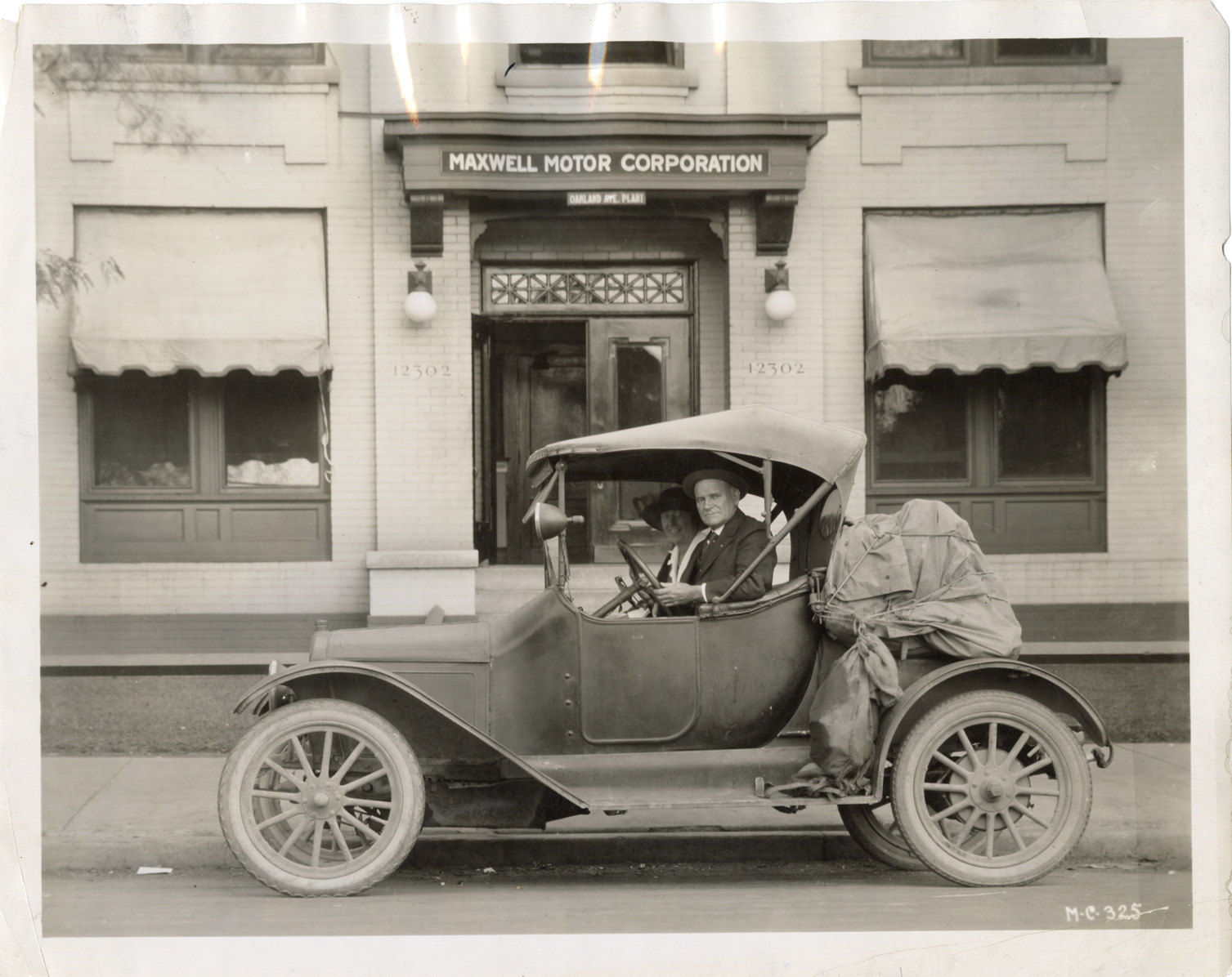 View of motorists posing in a 1915 Maxwell roadster. Maxwell Motor Corporation, Oakland Avenue Plant building in background. Handwritten on back: "1915 Maxwell roadster."