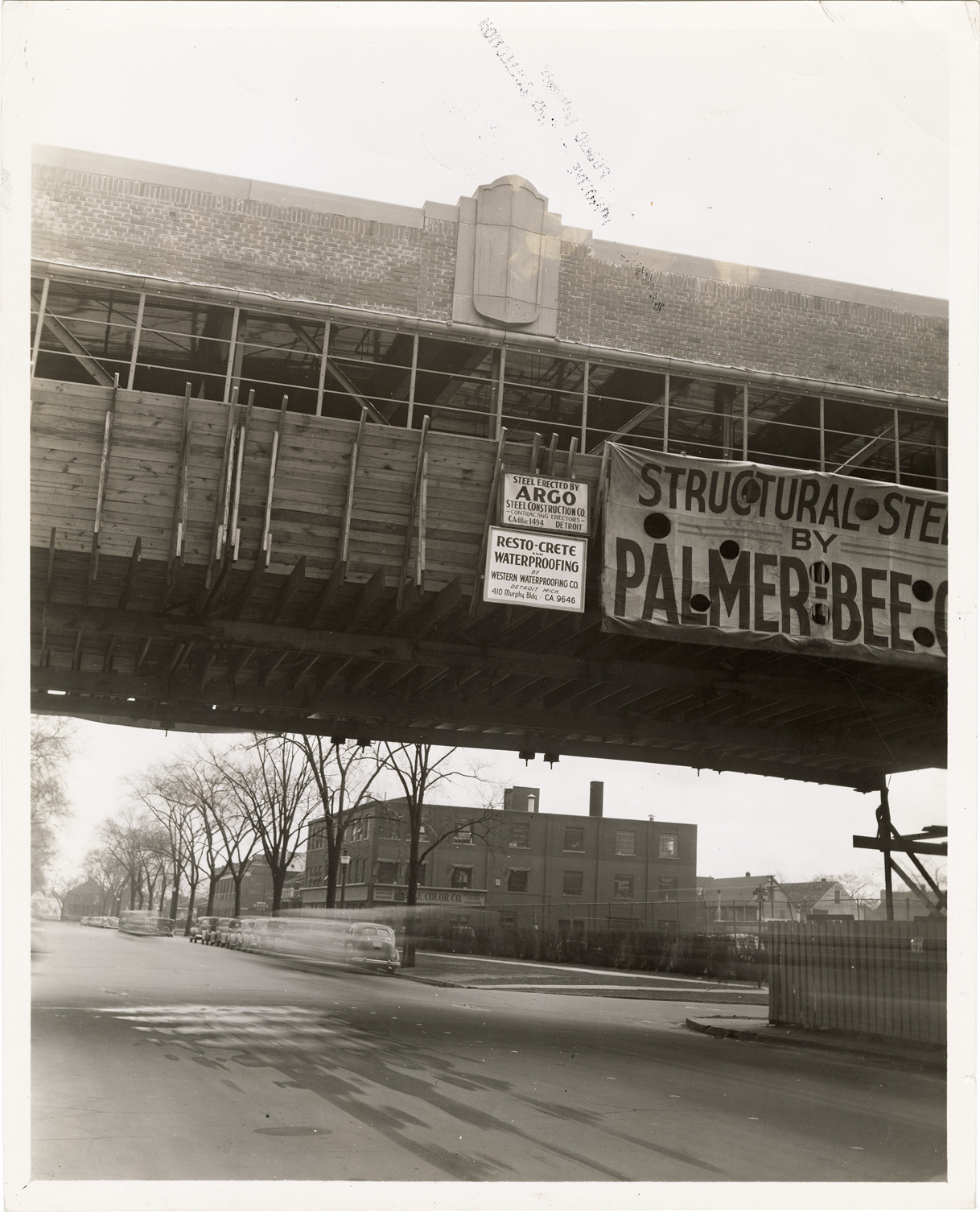 Close-up view of pedestrian bridge at the Packard Motor Car Company factory during construction. Banner on scaffolding reads: "Structural steel by Palmer Bee Co." Signs on scaffolding read: "Steel erected by Argo Steel Construction Co., contracting erectors, Cadillac 1494, Detroit" and "Resto-Crete and waterproofing by Western Waterproofing Co., Detroit, Mich. 410 Murphy Bldg., CA. 9646." Typed on back: "Bridges." Stamped on back: "Apr 25, 1939."