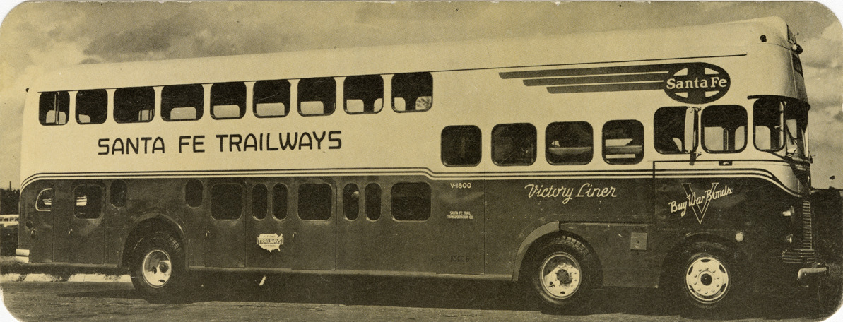 View of a Santa Fe Trailways bus. Painted on side of bus: "Santa Fe Trailways," "Victory liner" and "Buy War Bonds." Printed on back: "For transportation to war plants. Seats 117 passengers. One of a fleet of special buses soon to be in service from Central Los Angeles to Douglas and Lockheed war plants in Santa Monica and Burbank, California. Ride Santa Fe to victory. Sante Fe Trailways Div. Western Art Post Card Co."