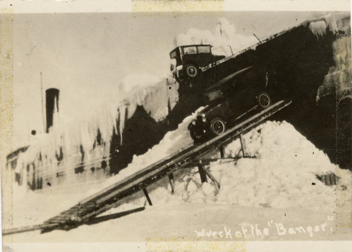 View of Chrysler cars on ice-encrusted ship "City of Bangor" in the aftermath of shipwreck. The City of Bangor came ashore at Keweenaw Point, carrying Chrysler and Whippet cars. Printed on front: "Wreck of the Bangor." Handwritten on back: "Chrysler cars. Bangor shipwreck. Came ashore at Keweenaw Point, November 30, 1926. Carried Chrysler & Whippet automobiles."