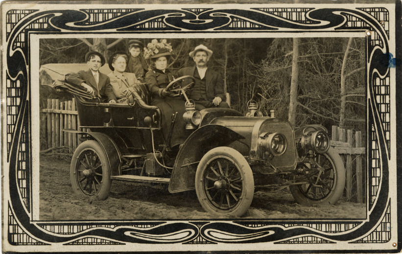 View of motorists posing in a car. Handwritten on back: "Hello Kid, What do you think this. I told you to think of me but you did not so I will send you one I know you would like to get one of these to see how they look. It is raining here today. I hope you come back here this winter. Best regards, Mrs. B." Card is postmarked November 10, 1909.