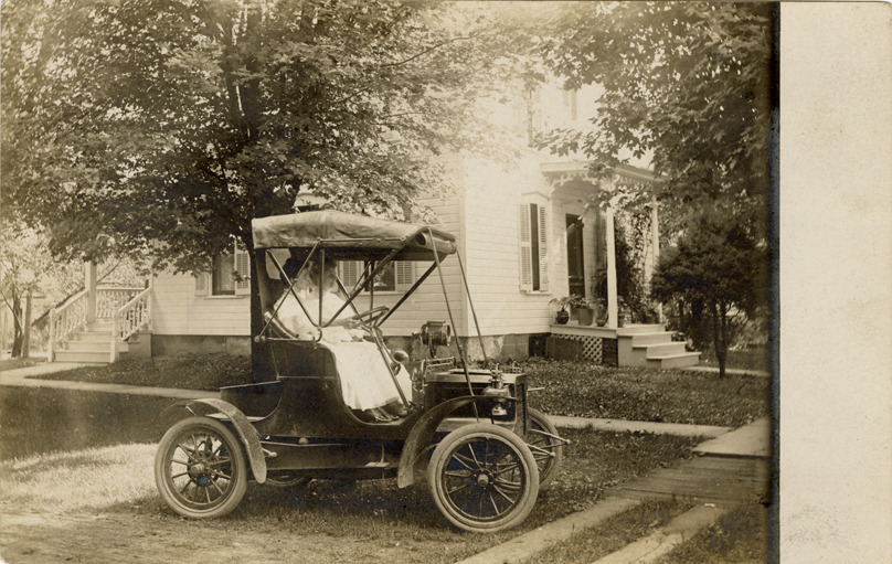 View of women motorists posing in a car. Wooden-frame house in background. Handwritten on back: "Ada can run the auto. She run it over here one Sunday 'all but two miles' she said. I think that was fine don't you? Dr. run in a tree & in a ditch first when he began."