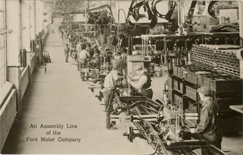 View of assembly line workers with Ford car chassis at the River Rouge Plant. Printed on front: "An assembly line of the Ford Motor Company." Printed on back: "An assembly line of the Ford Motor Company. The assembly line is always a point of interest to visitors of the Rouge Plant. Here, on a moving conveyor, Ford cars are completely assembled, from chassis to finished car, and driven off the line under their own power. In addition to the Rouge plant, there are 31 assembly lines in company branches throughout the United States. The Garraway Company, Rutherford, New Jersey."