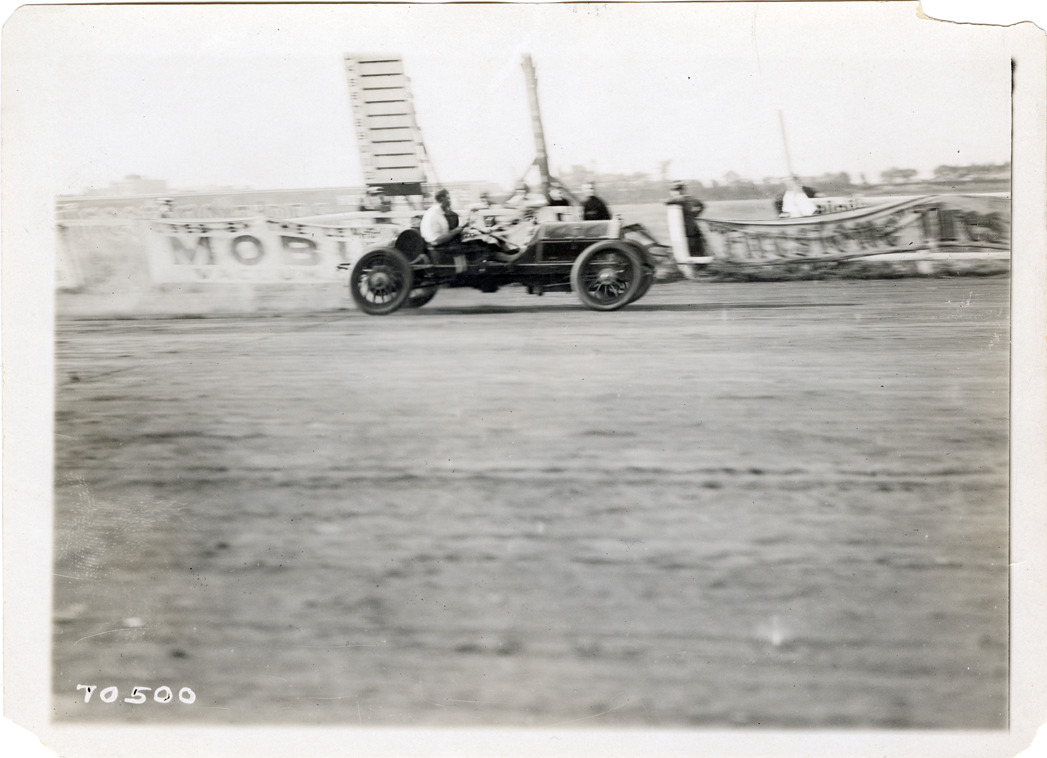 View of Hughie Hughes racing Mercer car on track during 1911 Brighton Beach races in New York. Stamped on back: "Spooner & Wells, Inc., photographers, telephones 3472-3473 Columbus, 1931 Broadway, New York." Handwritten on back: "Hughes, Mercer. Brighton Beach, 1911."