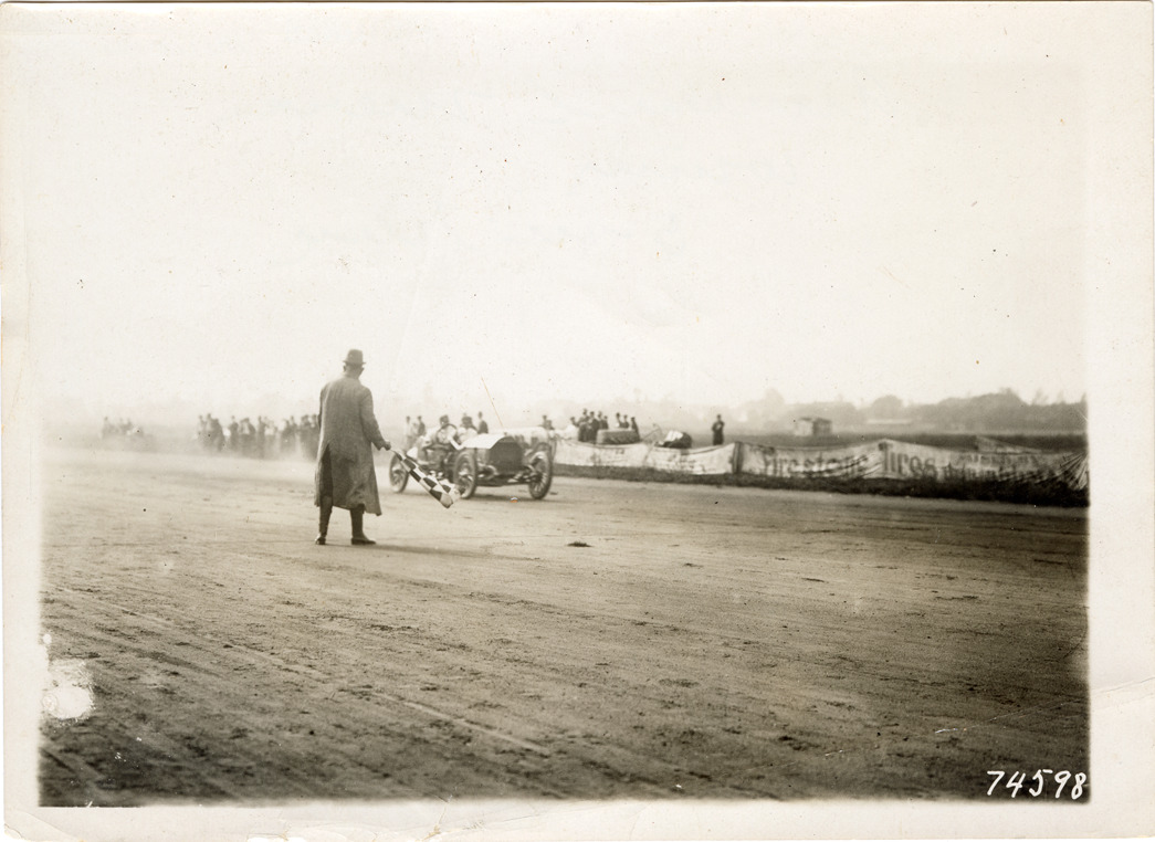 View of driver racing Mercer car on track during 5 Mile Race. Official waves flag in foreground. Stamped on back: "Spooner & Wells, Inc., photographers, 1931 Broadway, N.Y. City, phones 3472-3473 Col." Handwritten on back: "[undecipherable] Mercer winning 5 mi race."